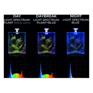 Aquael BT also allows you to create your own lighting schedules that meet the individual requirements of fish and plants. With its help, you can also program cycles that mimic natural changes of light during the day, such as dawn and dusk. The lighting gradually brightens, simulating morning and dawn, which allows fish and plants to smoothly transition from night to day mode. Aquarium width [in / cm] 12.6 – 22.6 / 31.9 – 57.4 Power [W] 30 Dimensions [in / cm] (width x depth x height) 12.4 x 9.9 / 0.7 / 31.4 x 25.2 x 1.7 Lumens 3100 Color temperature [K] 7000 – 10000