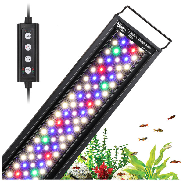 Here is why this LED light is so great: it comes with a timer and lets you create a natural light cycle with adjustable intensity. You can set the time to 6, 10, or 12 hours, or set it to 24/7 mode, which’ll adjust the colors based on the time of day. The LED light is full-spectrum with individual color options, and it’s also a waterproof light. You can easily adjust it to fit various tank sizes using extendable brackets. Whether you’re just starting or an experienced aquarium expert, the light offers the power, flexibility, and vibrant color spectrum your tank needs to thrive.